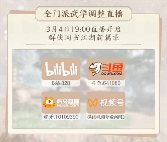 大唐江湖全新篇章帷幕初啟!新一輪全門(mén)派武學(xué)調(diào)整直播將于3月4日19:00全網(wǎng)同步開(kāi)播,歡迎俠士們鎖定各大平臺(tái),不見(jiàn)不散!