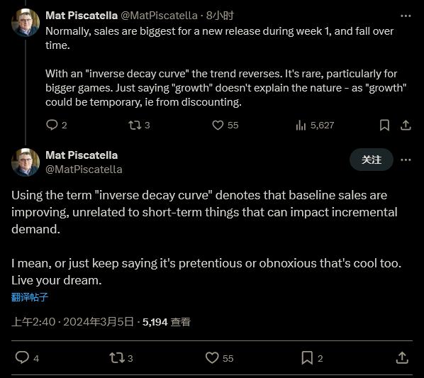 Piscatella將游戲的銷(xiāo)量稱(chēng)為“確確實(shí)實(shí)的逆衰減曲線(xiàn)”,他表示這非常非常罕見(jiàn),并將游戲的表現(xiàn)評(píng)為“十分驚人”。他解釋道:“通過(guò)‘逆向衰減曲線(xiàn)’,趨勢(shì)會(huì)逆轉(zhuǎn)。這種情況非常少見(jiàn),特別是對(duì)于大型游戲而言。僅僅說(shuō)說(shuō)‘增長(zhǎng)’并不能解釋其本質(zhì)——因?yàn)?lsquo;增長(zhǎng)’可能只是暫時(shí)的,即來(lái)自折扣。”