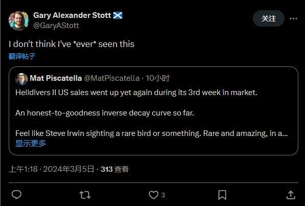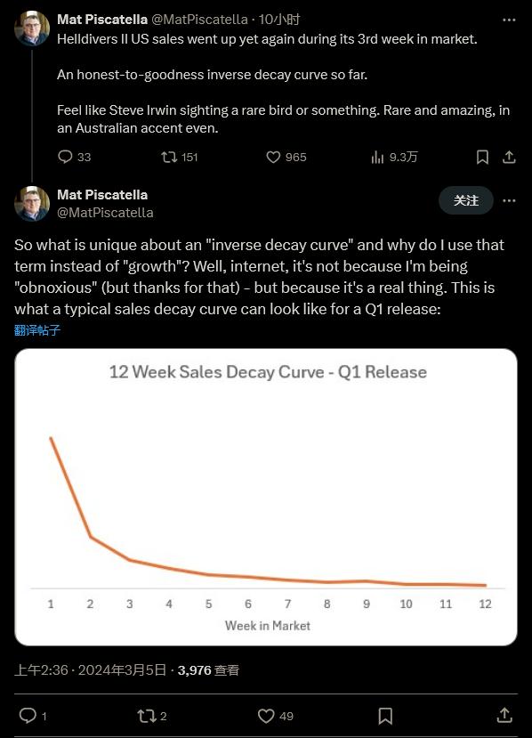 在推特上,行業(yè)分析師 Mat Piscatella指出,《絕地潛兵2》打破了對(duì)游戲銷(xiāo)量分析的傳統(tǒng)觀(guān)念,即游戲通常會(huì)在發(fā)布后第一周達(dá)到最高銷(xiāo)量然后逐漸下降,知道重大更新或折扣等刺激銷(xiāo)量增長(zhǎng)。然而自2 月 8 日起,《絕地潛兵2》一直沒(méi)有任何的大型內(nèi)容更新和大型的促銷(xiāo),但銷(xiāo)量仍然在持續(xù)增長(zhǎng)。他還展示了游戲銷(xiāo)量正常的曲線(xiàn)圖。