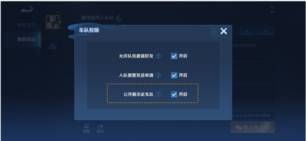 新增公開此車隊設(shè)置,默認(rèn)為打開,關(guān)閉設(shè)置后,將不會推薦給好友展示,玩家個人名片中也不會展示該車隊