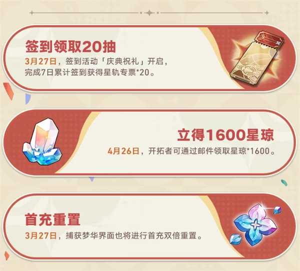 除以上新地圖場(chǎng)景及角色的情報(bào)外,本次更新也將迎來(lái)崩壞星穹鐵道一周年生日,開(kāi)拓者可通過(guò)簽到的形式獲得星軌專票*20,還可在周年慶4月26日當(dāng)天獲得星瓊*1600和燃料*10的福利,捕獲夢(mèng)華界面將進(jìn)行首充雙倍重置;新玩家首次體驗(yàn)游戲,最高可獲得總計(jì)100抽的福利,老玩家回歸參與回歸活動(dòng),最高可獲得20抽+2800星瓊獎(jiǎng)勵(lì)!