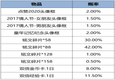 打開后可隨機(jī)獲得以下獎勵之一:點(diǎn)贊2020頭像框、2017情人節(jié)-女朋友頭像框、2017情人節(jié)-男朋友頭像框、童年記憶紀(jì)念頭像框、雙倍金幣卡:1日、雙倍經(jīng)驗(yàn)卡:1日、銘文碎片x158/128/88/58。上架時間:3月15日0:00-3月18日23:59價(jià)格:600金幣概率公示: